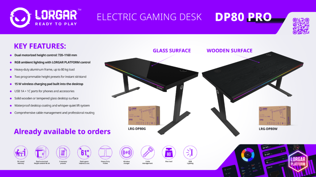 LORGAR разширява своята гейминг екосистема с представянето на професионалната серия Desk PRO 80, проектирана да издигне както гейминг представянето, така и продуктивността на работното място. Новата серия комбинира усъвършенствано моторизирано регулиране на височината с интегрирана технология за зареждане и персонализируемо RGB осветление, създавайки перфектния команден център за съвременни геймъри и професионалисти.